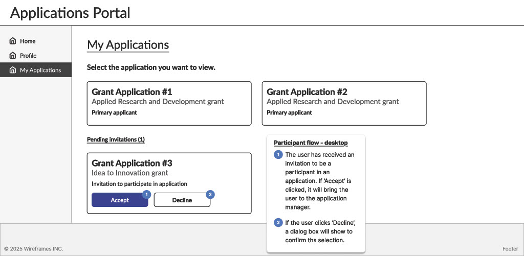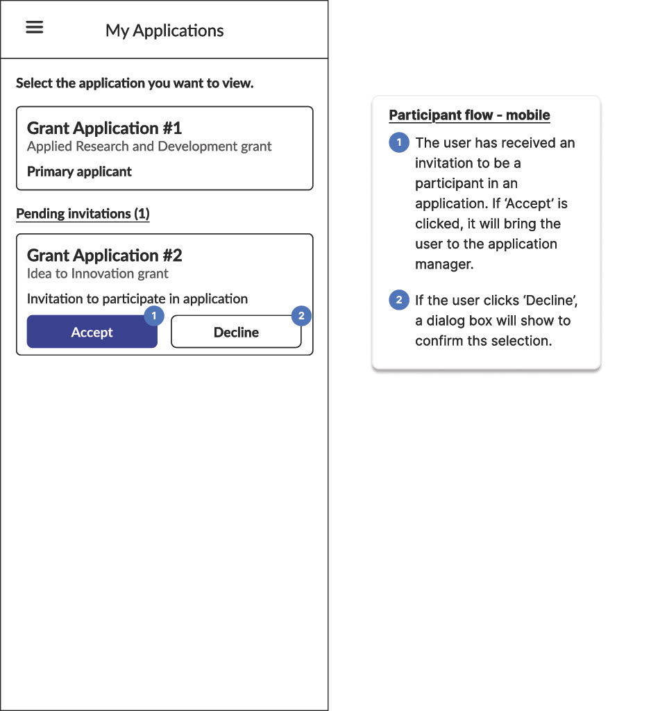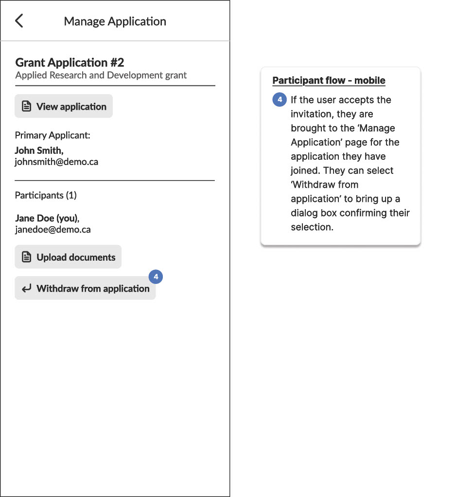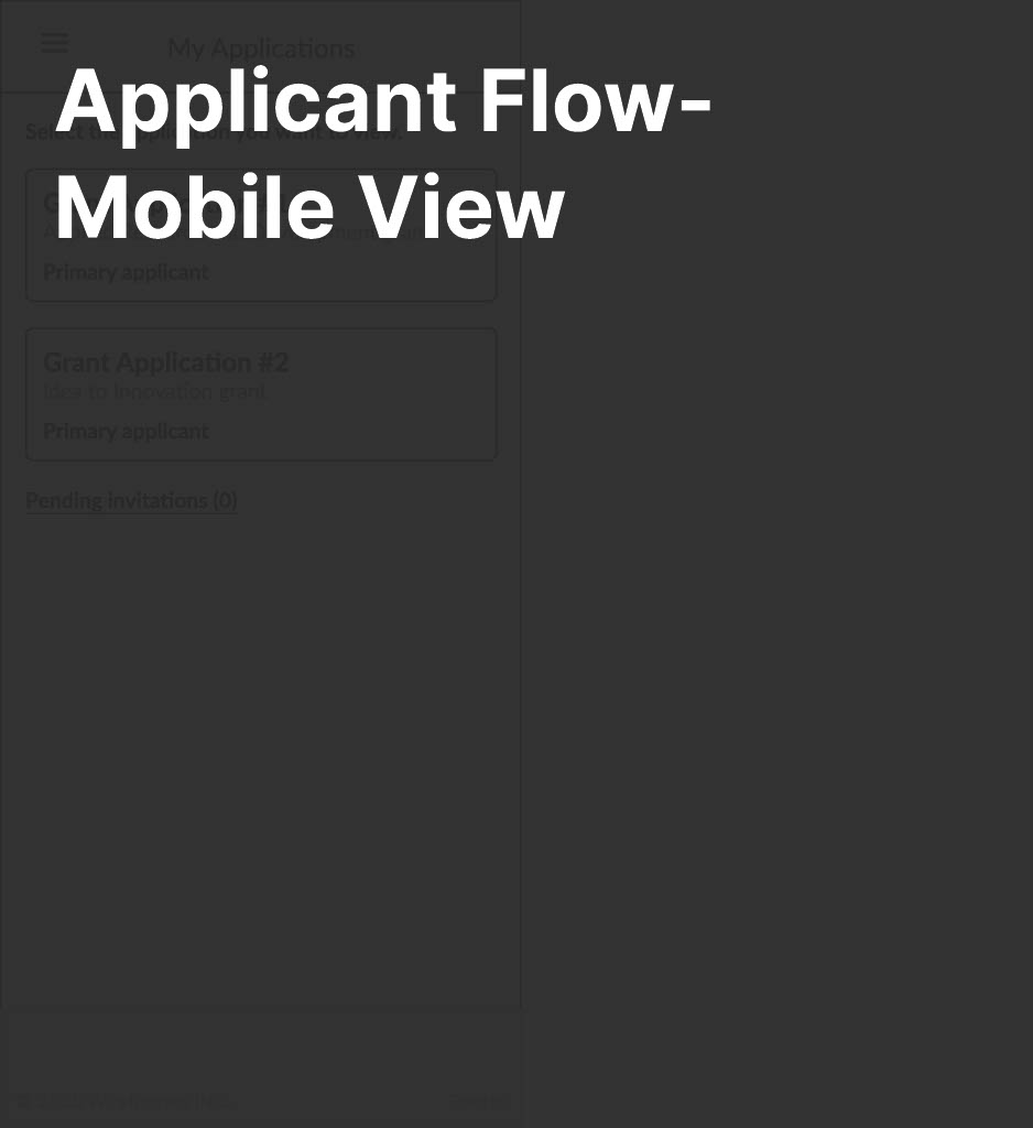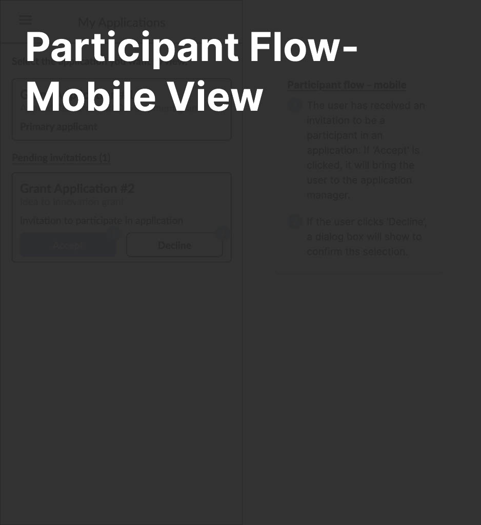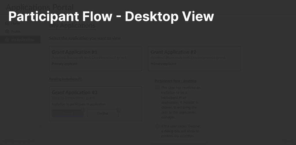 I designed a set of Figma wireframes to support a full applicant–participant workflow for a grant application portal. Based on defined user stories, the wireframes map out how primary applicants invite or remove participants and how participants accept, decline, or withdraw from applications. The flows include mobile and desktop interactions such as sending and managing invitations, confirming actions through modal dialogs, and updating application states across the portal. Click here to see the Figma file for this project, and use the arrows to click through the screens below.