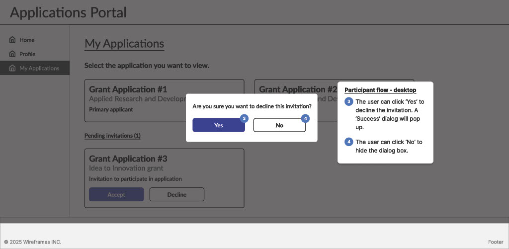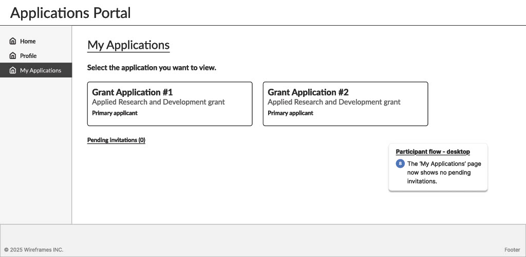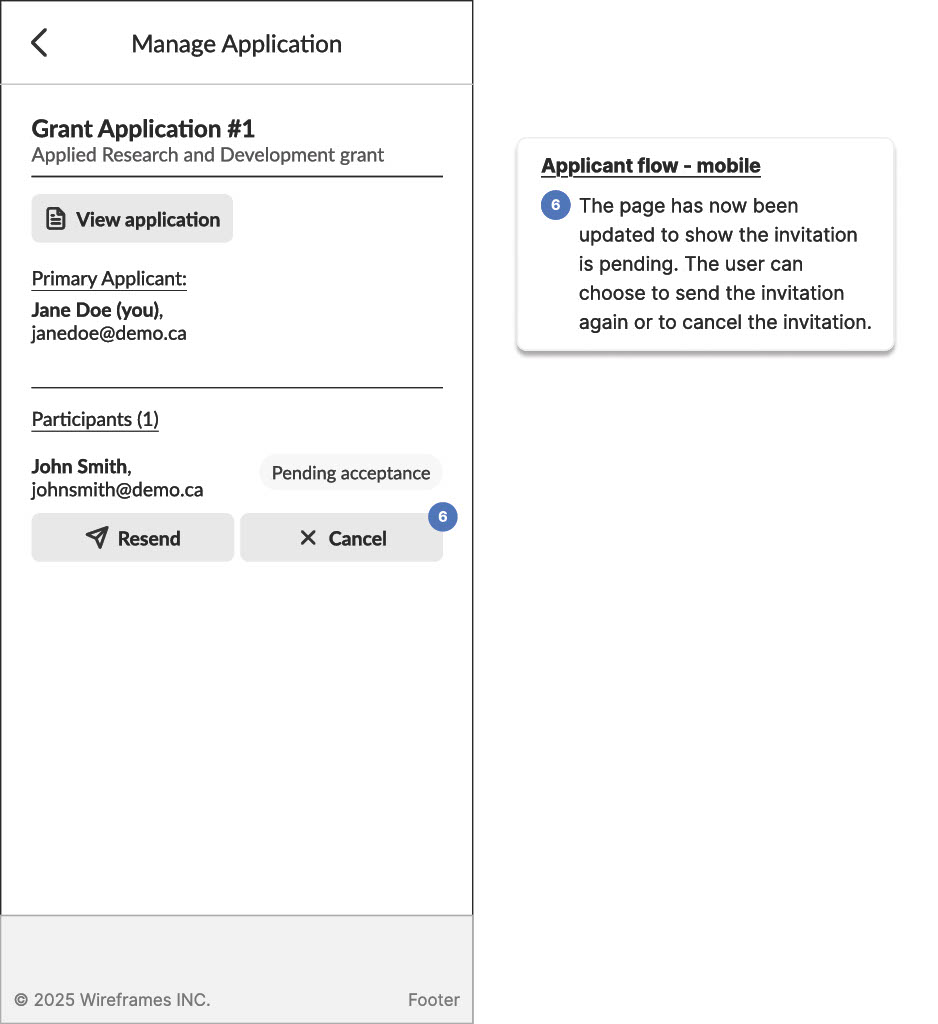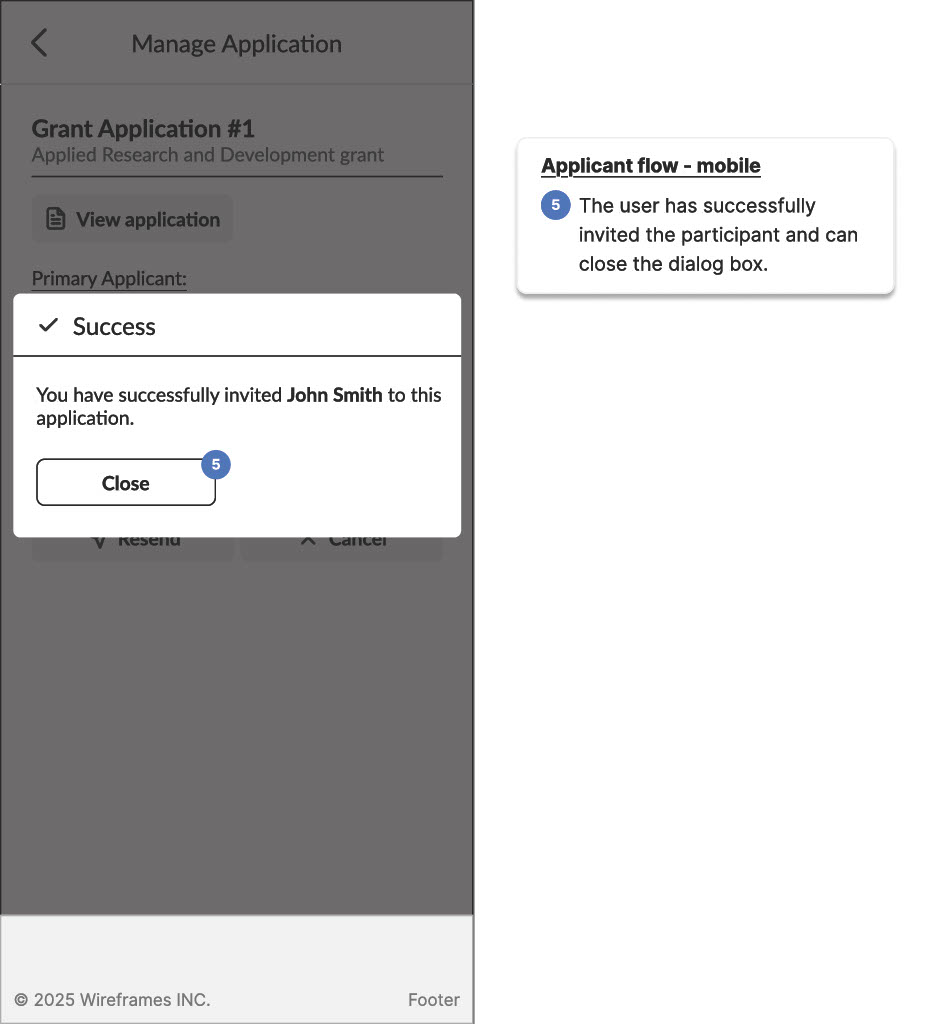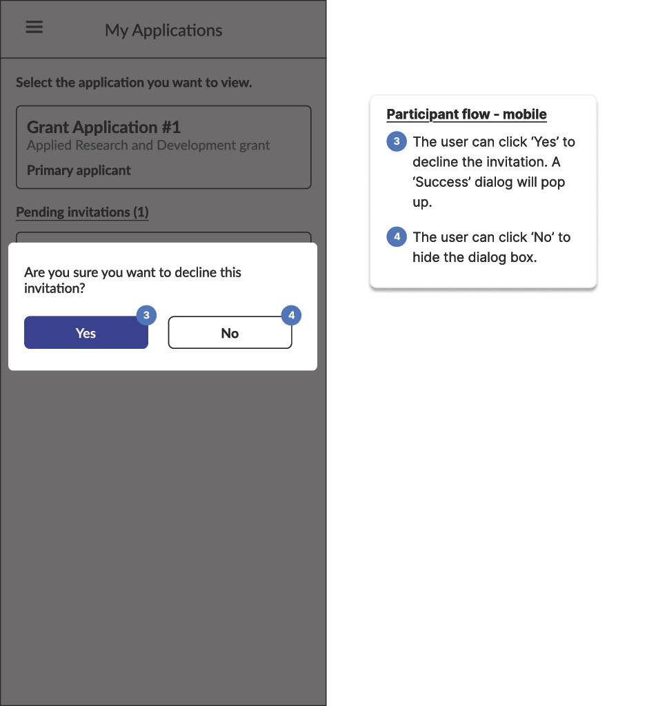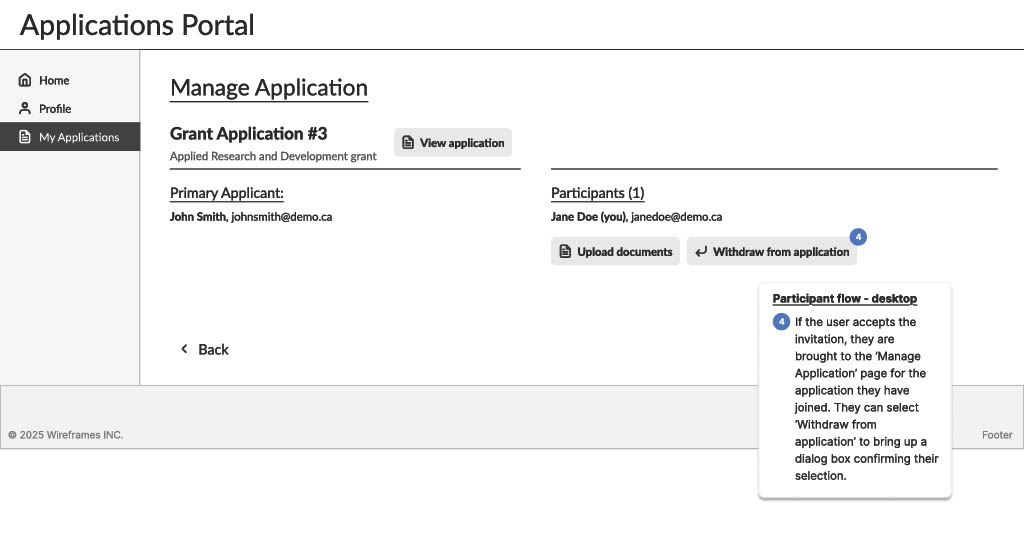 I designed a set of Figma wireframes to support a full applicant–participant workflow for a grant application portal. Based on defined user stories, the wireframes map out how primary applicants invite or remove participants and how participants accept, decline, or withdraw from applications. The flows include mobile and desktop interactions such as sending and managing invitations, confirming actions through modal dialogs, and updating application states across the portal. Click here to see the Figma file for this project, and use the arrows to click through the screens below.