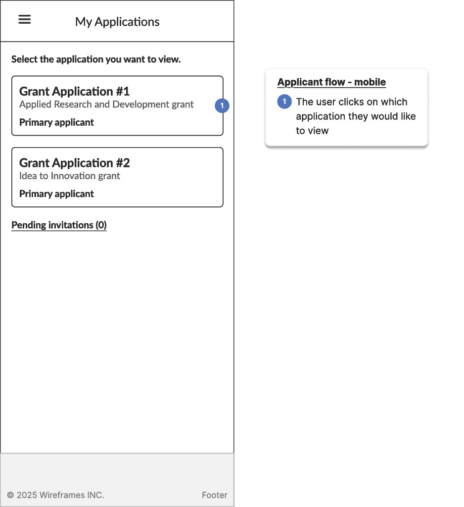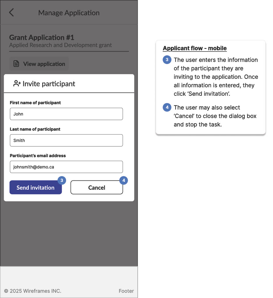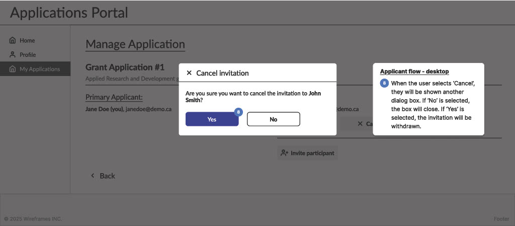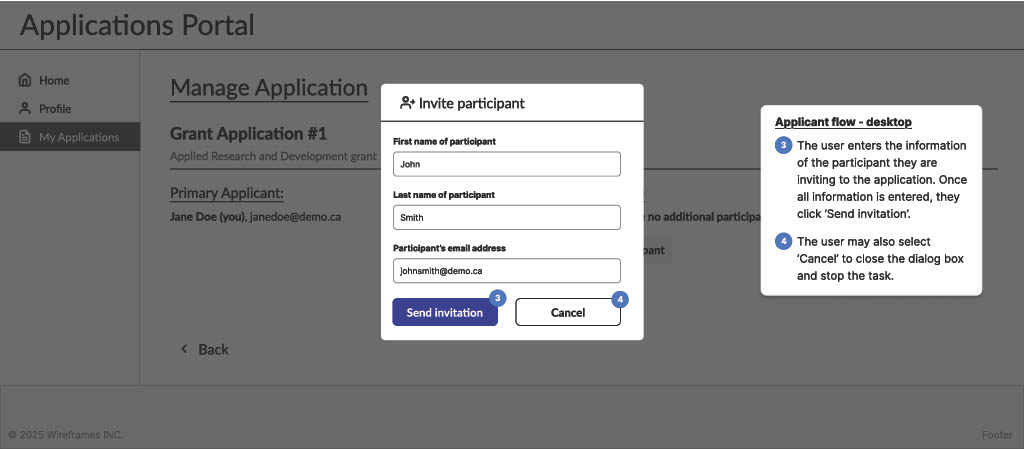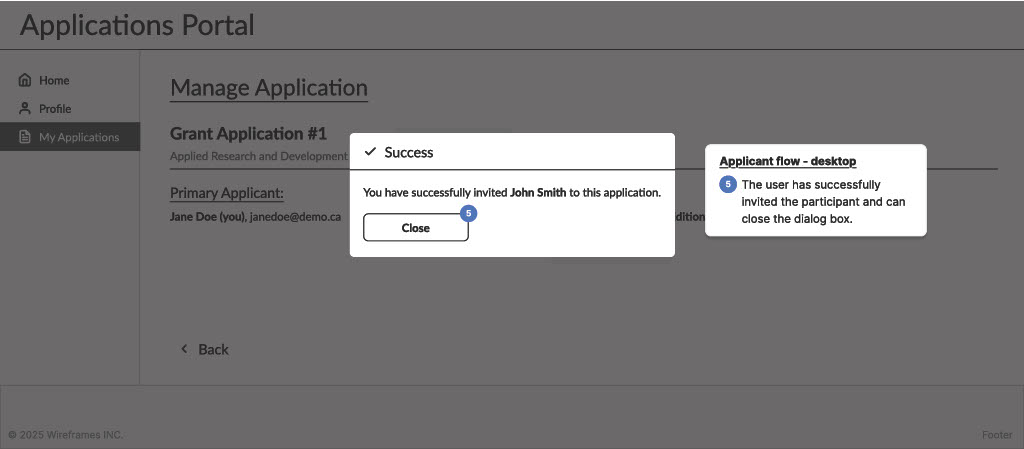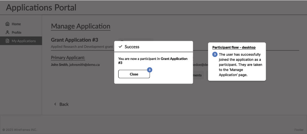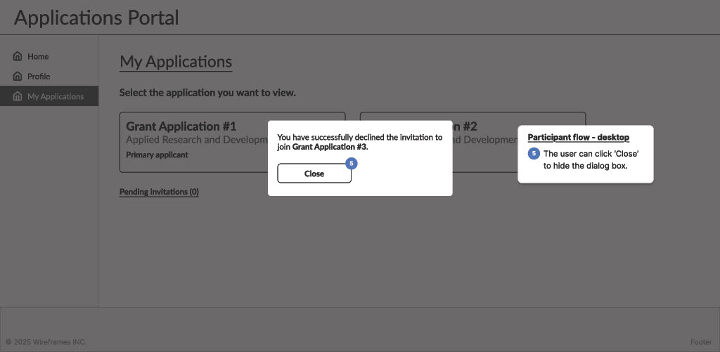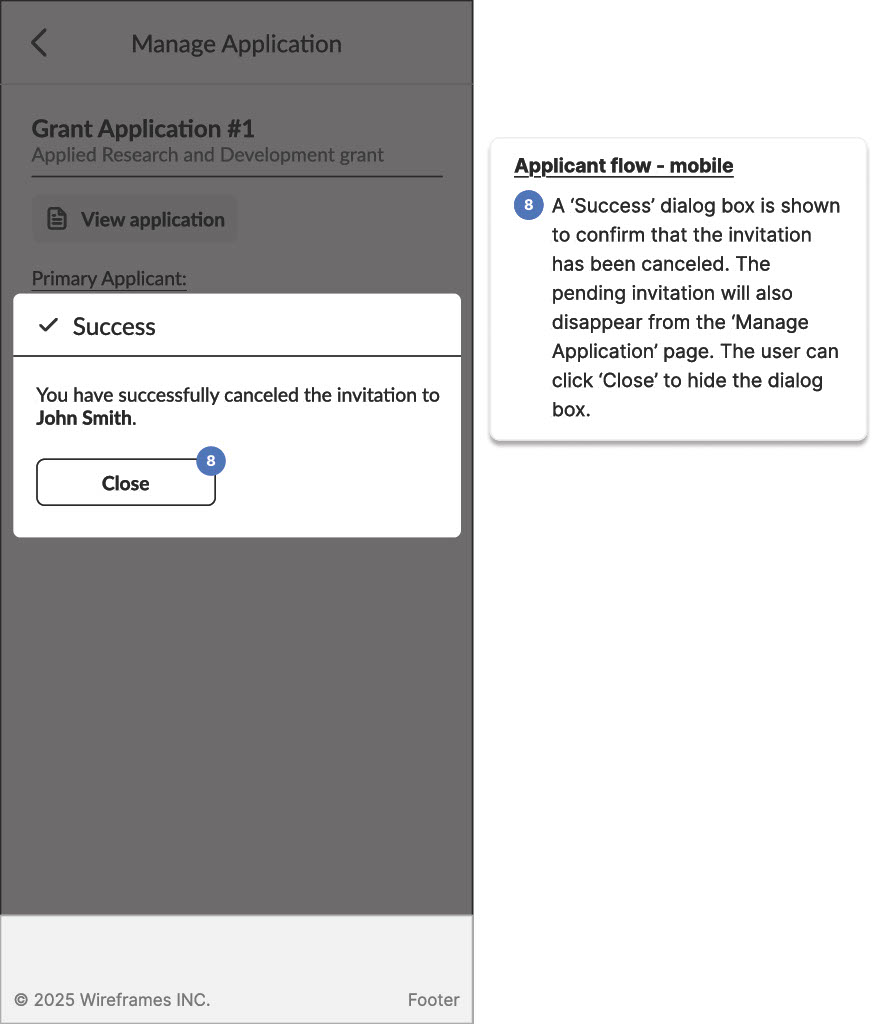 I designed a set of Figma wireframes to support a full applicant–participant workflow for a grant application portal. Based on defined user stories, the wireframes map out how primary applicants invite or remove participants and how participants accept, decline, or withdraw from applications. The flows include mobile and desktop interactions such as sending and managing invitations, confirming actions through modal dialogs, and updating application states across the portal. Click here to see the Figma file for this project, and use the arrows to click through the screens below.