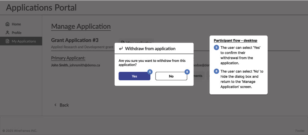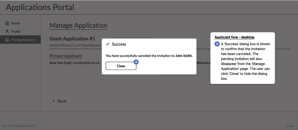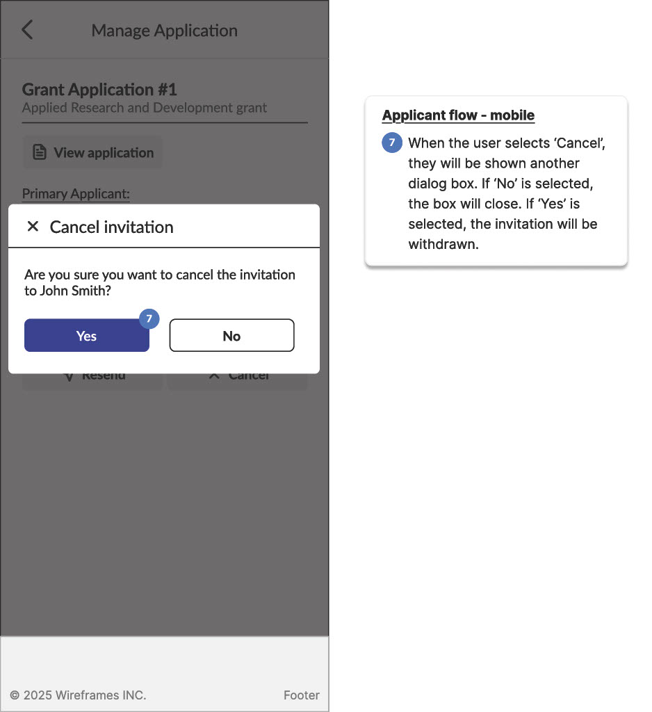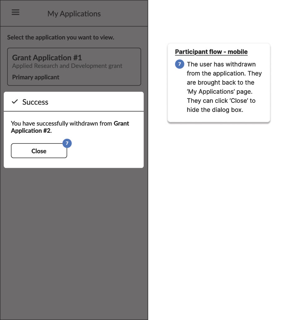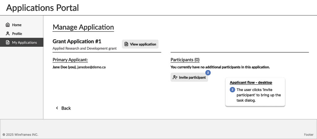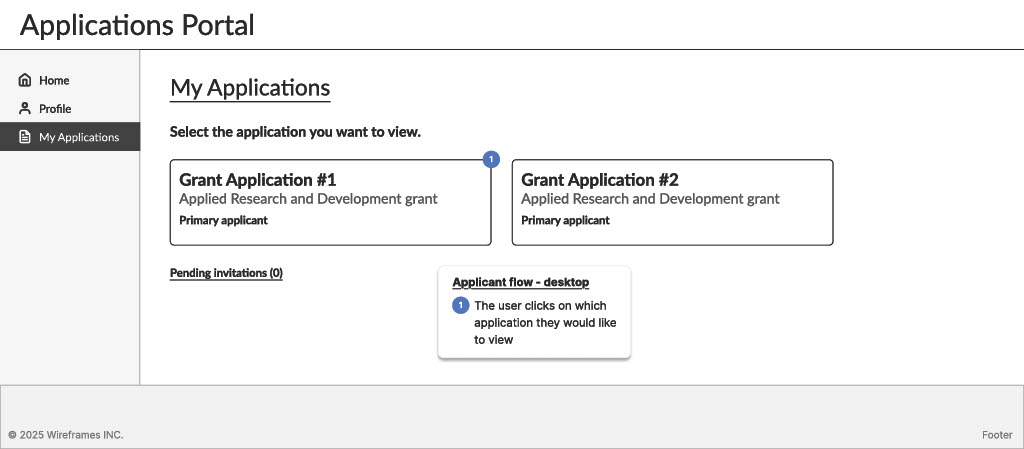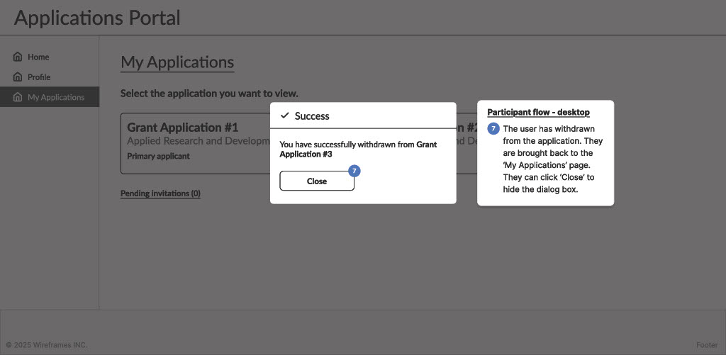 I designed a set of Figma wireframes to support a full applicant–participant workflow for a grant application portal. Based on defined user stories, the wireframes map out how primary applicants invite or remove participants and how participants accept, decline, or withdraw from applications. The flows include mobile and desktop interactions such as sending and managing invitations, confirming actions through modal dialogs, and updating application states across the portal. Click here to see the Figma file for this project, and use the arrows to click through the screens below.